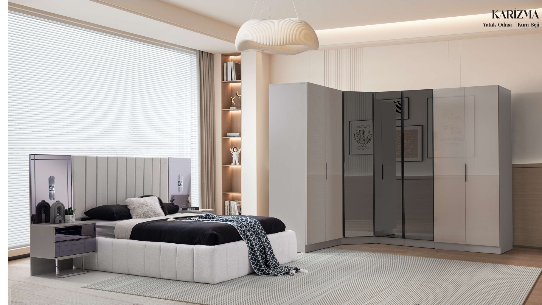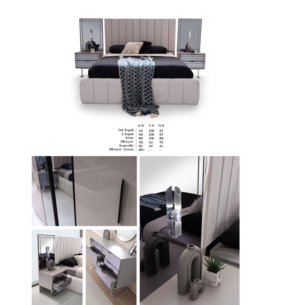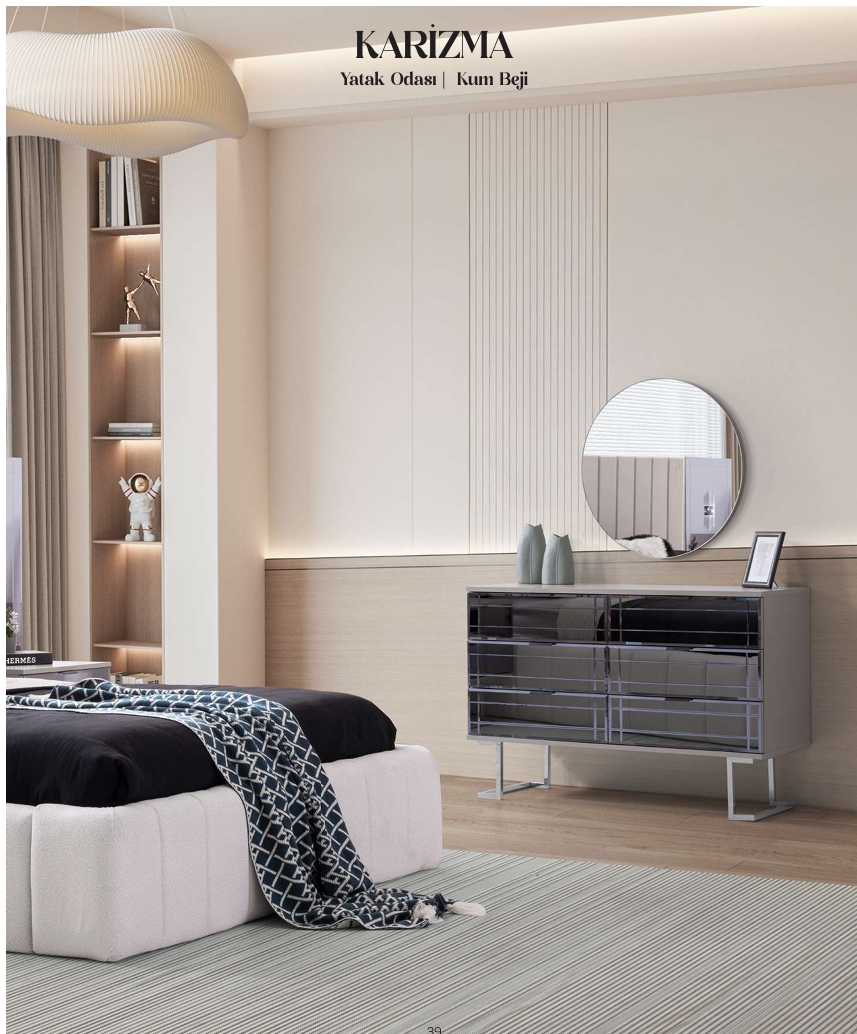 Das KARİZMA Schlafzimmer vereint stilvolle Eleganz mit durchdachter Funktionalität. Die sanfte Kum Beji-Farbgebung schafft eine warme, einladende Atmosphäre, die Ruhe und Geborgenheit ausstrahlt.